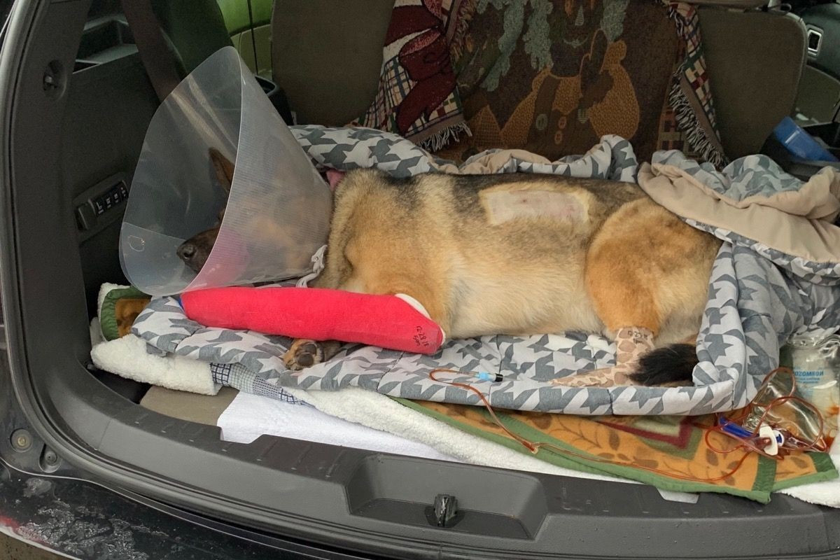 We picked her up, drove her 30 miles to the closet ER. They did CPR on her, gave her meds, trying to reduce swelling on her brain (she is fine neurology as of right now, this is just a precaution) she IS responding and tail wagging (I did get to see her) She does however have 4 broken ribs, and 3 broken legs.... she will need surgery on 2 of the 3 legs.....This girl is one hell of a fighter that’s for sure, she is in critical condition to say the least..... she did look at us and wagged her tail... I am still in shock, I can not believe this woman didn’t see two vehicles with lights on, and 3 people standing in the road.