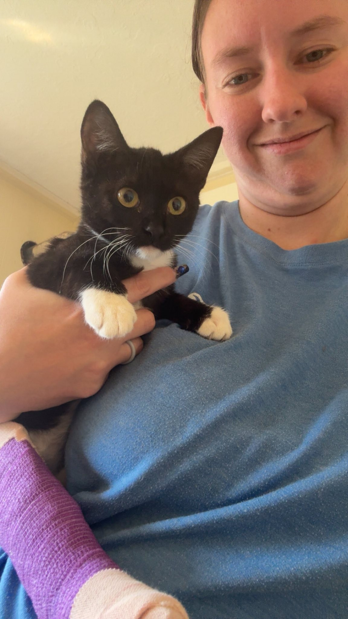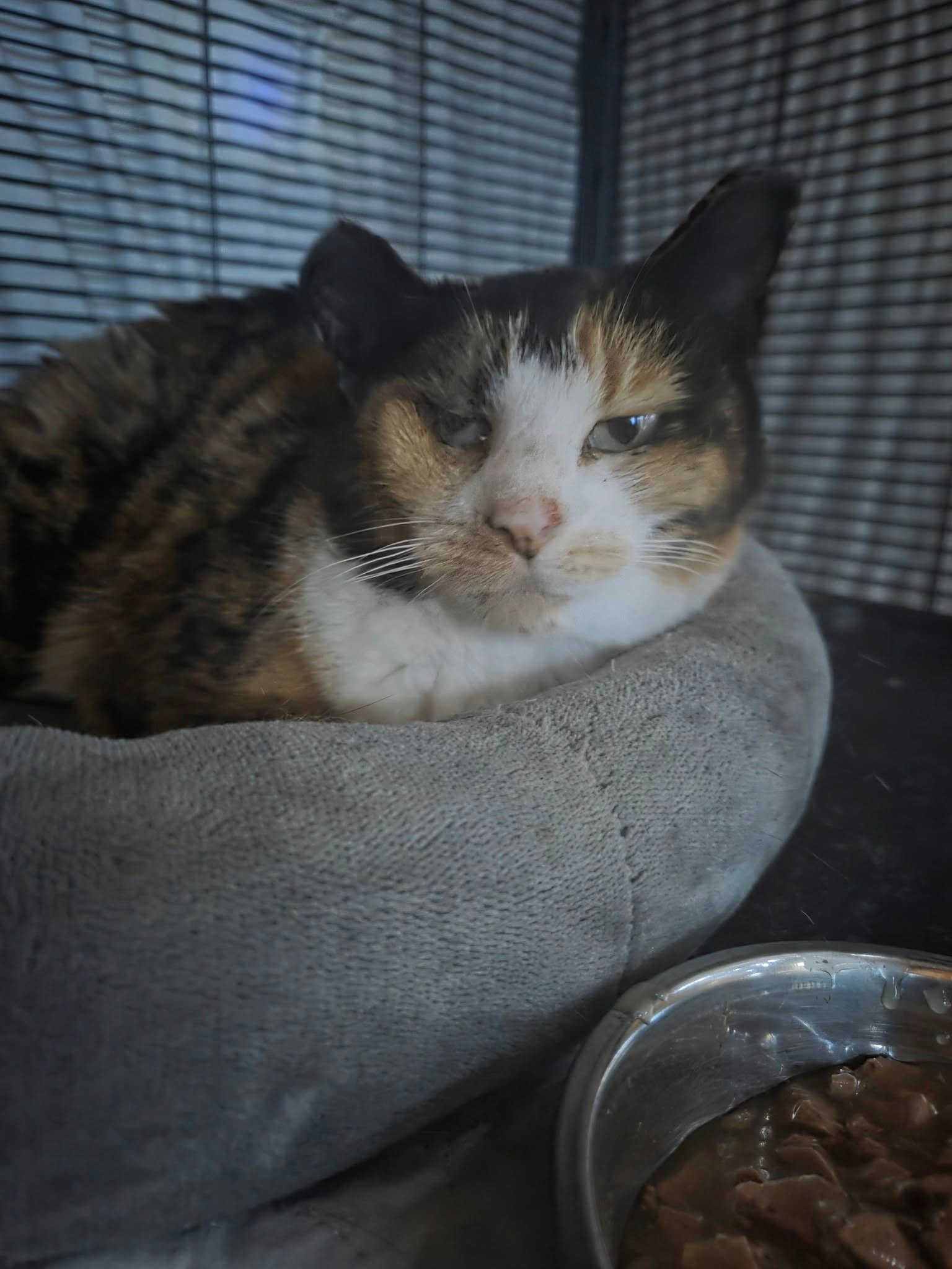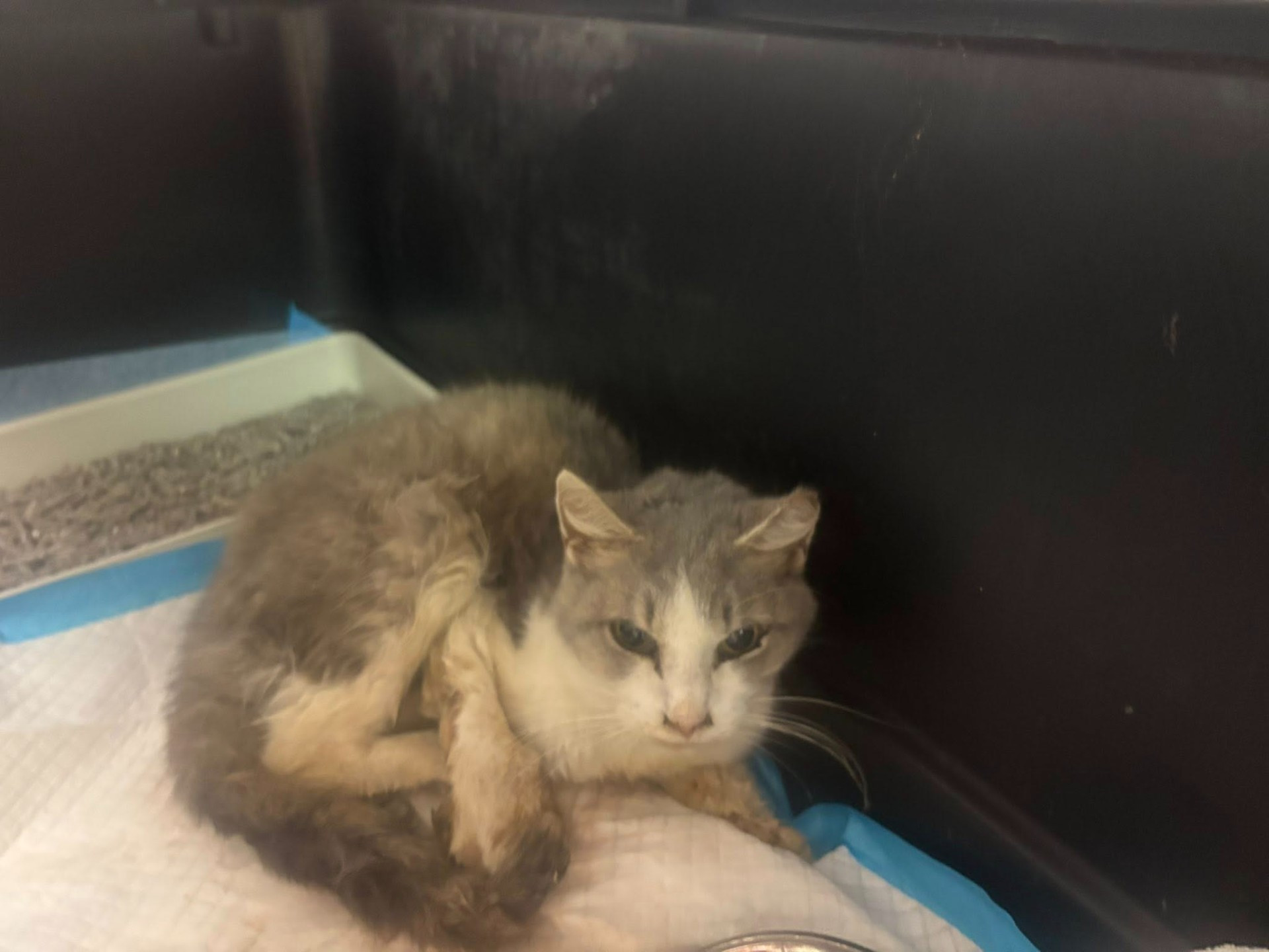Meet Periwinkle! Friday morning this poor soul was found at a store in Uniontown. She was in a box in the cart area. Some amazing workers were able to get her safely in a carrier and reach out to us. We are not open on Fridays but an employee happened to see the message come in. An amazing lady( who actually brought sick kittens (that someone found) to us a few months back) drove the whole way here from Uniontown to meet our employee. Within a few hours of finding the cat they not only got her to us but the employees raised money towards her care! Upon arrival Periwinkle was immediately started on pain meds and antibiotics. The smell of infection was absolutely horrific. Periwinkle has pillow foot and rotting flesh. We honestly are not sure what all this poor baby has been through but her Injuries are extremely extensive. We have had to soak her poor legs, debride the dead skin and wrap her legs. Periwinkle has a VERY long ahead of her but like with Ohana and many others...we will try our very best! Since Friday we have taken on 8 cats In need. Supplies are dangerously low and we especially In need of paper pellet cat litter. Our "needs" list In order of Importance at this time Is Paper Pellet Cat litter, paper towels, bleach, kitchen garbage bags, construction garbage bags, Churu's(besides being a yummy treat, we often use these to administer meds), Scott TP, hand soap and Dawn dish soap. Because of you Periwinkle has a chance at life...as do so many others. We thank you endlessly for enabling us to continue to make a difference 🩶 🤍